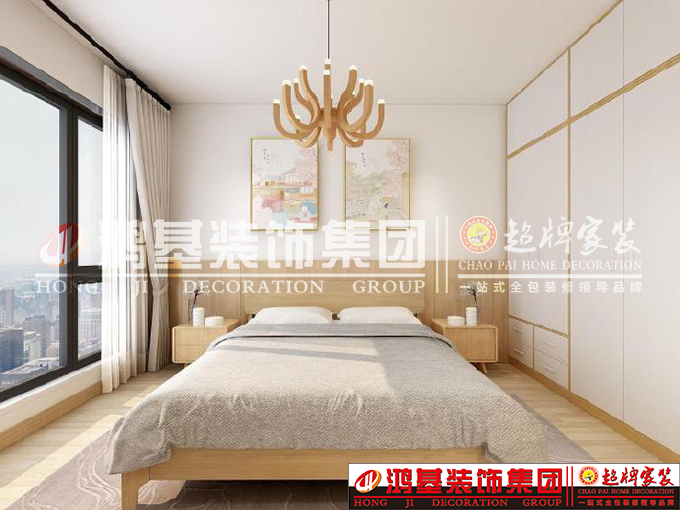 圖五:是主臥,原木色的衣柜搭配白色的柜門,整體自然,又干凈,大大的落地窗,自然采光極好。